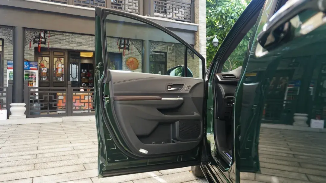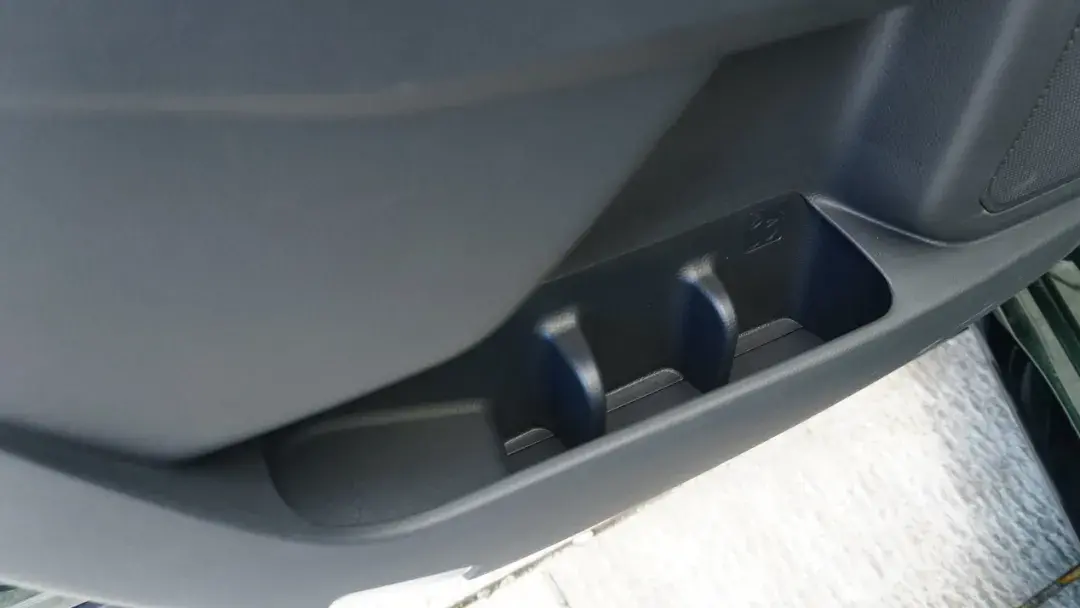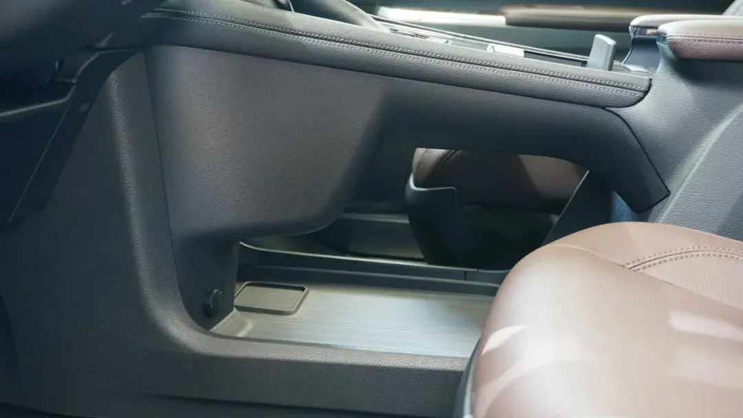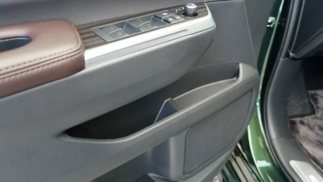 门板上同样别有洞天,储物格被分成上中下三层,最上层位于棕色车门拉手区域,可以放置高速通行卡等小件物品。中层位于门板中部,内部设计有高度差,可以放置手机、钱包、钥匙等物品。
