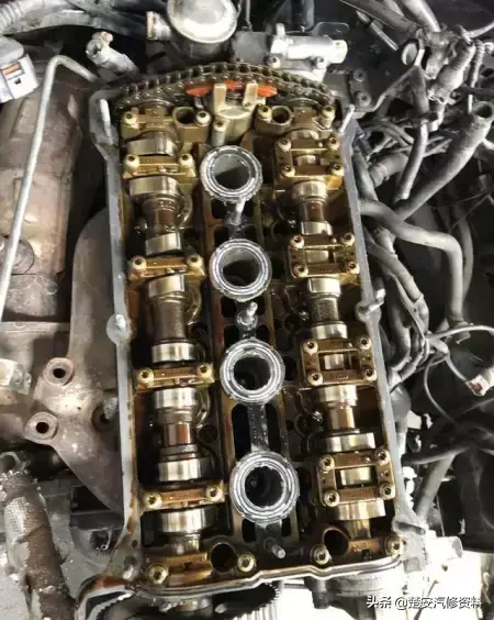 从发动机外观来看,明显有大修的痕迹,什么时间多少里程大修的看不出来,但是上任车主用的机油还是不错的,打开气门室罩盖可以看到明晃晃的,没有积碳。