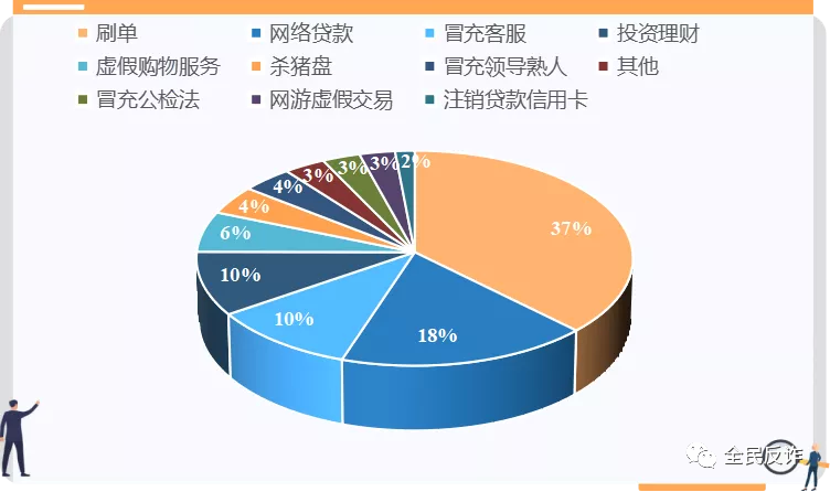 其中冒充电商物流客服理赔诈骗占10% ,和投资理财诈骗案发占比相当,前四种诈骗类型(刷单、网络贷款、冒充客服、投资理财)占全部案发的75%。