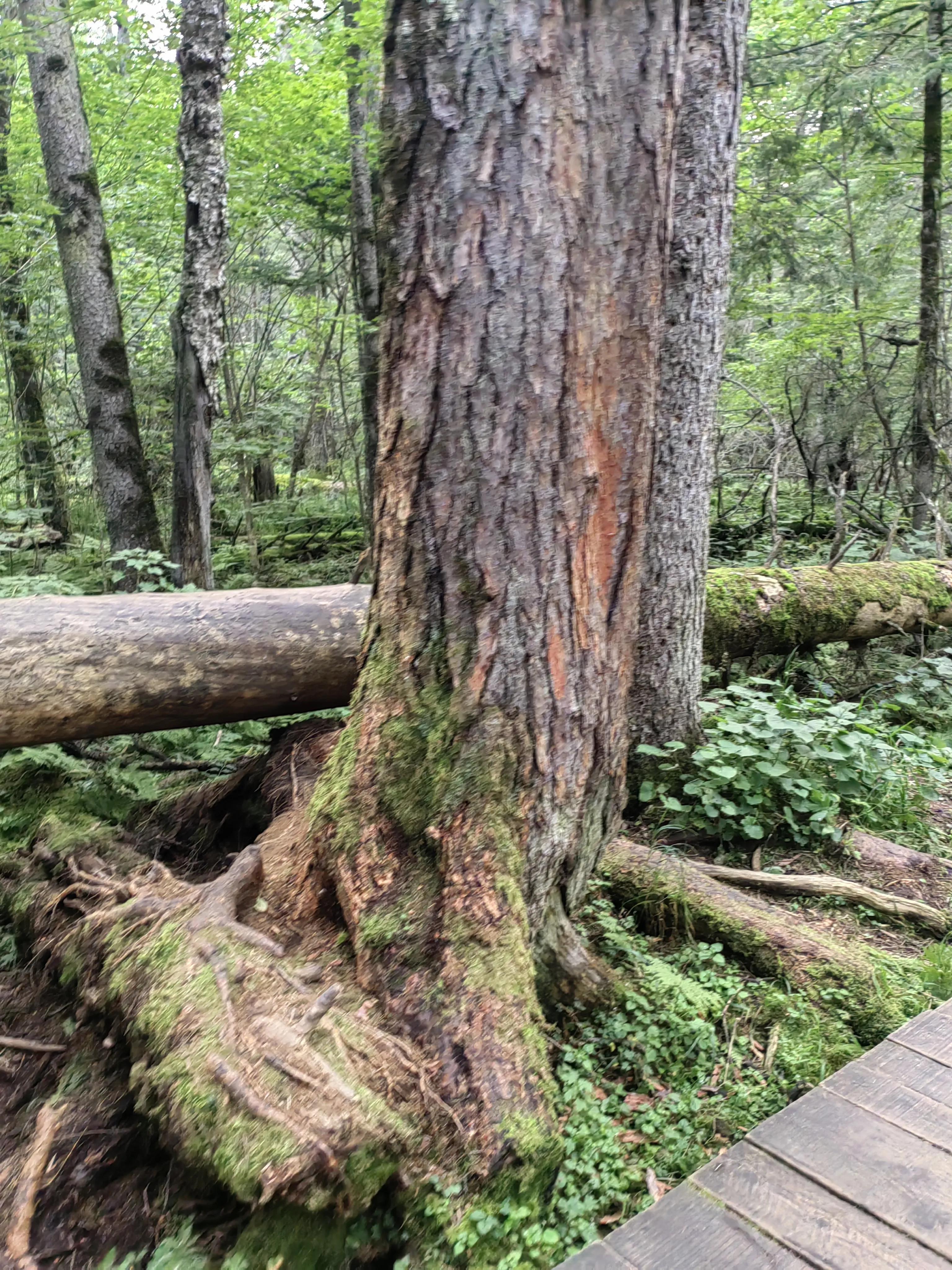 从瀑布下来,不用走原路,从树林中间,跟着出口方向,沿着林间栈道,一直往下走,即可到达下车的位置。林间栈道也非常美,两边都是岳桦林,岳桦林和东北常见的白桦林稍有区别,岳桦林经历的环境更加恶劣,会被风吹的东倒西歪,所以不是笔直的,很多看起来像树怪。