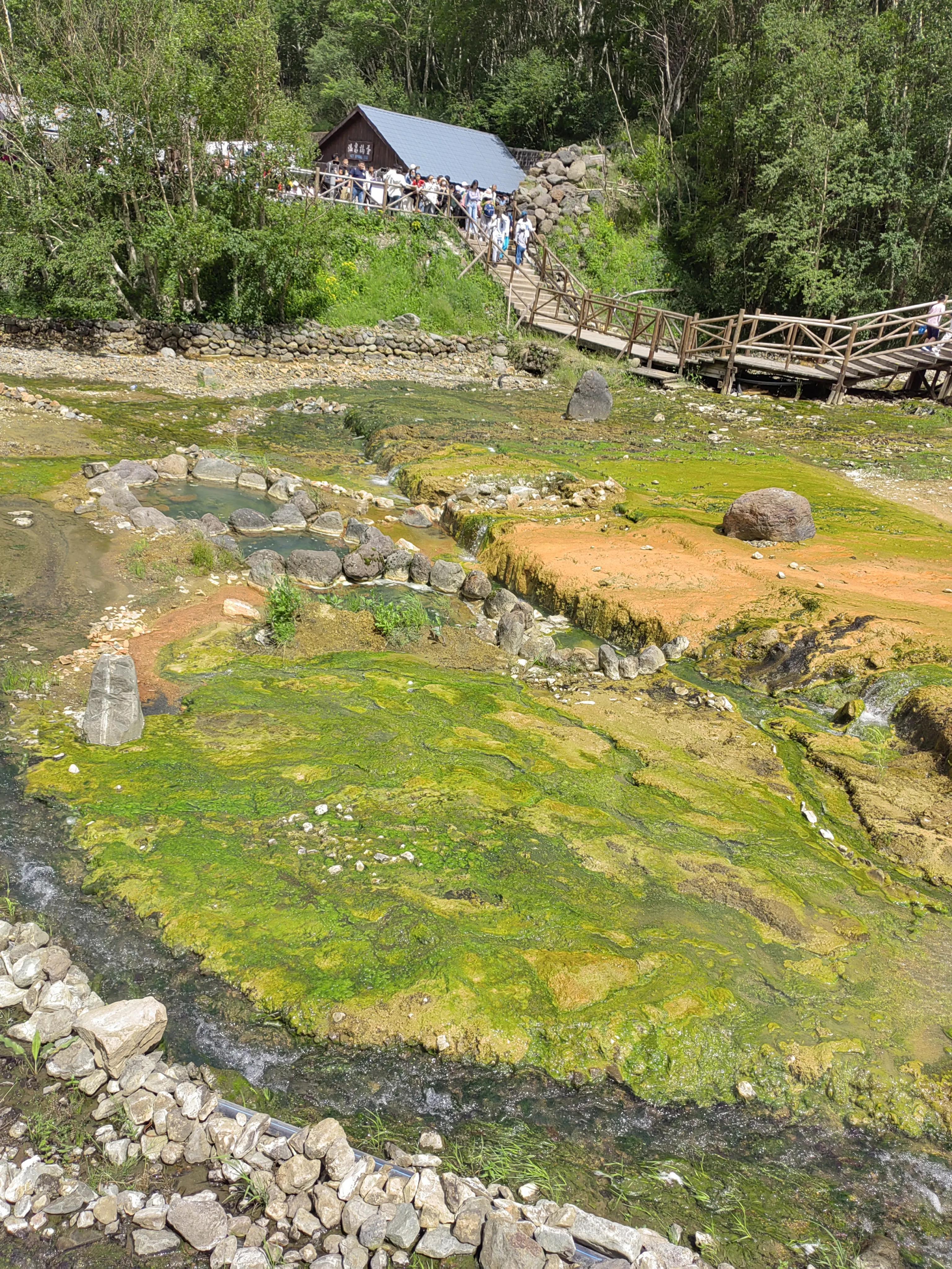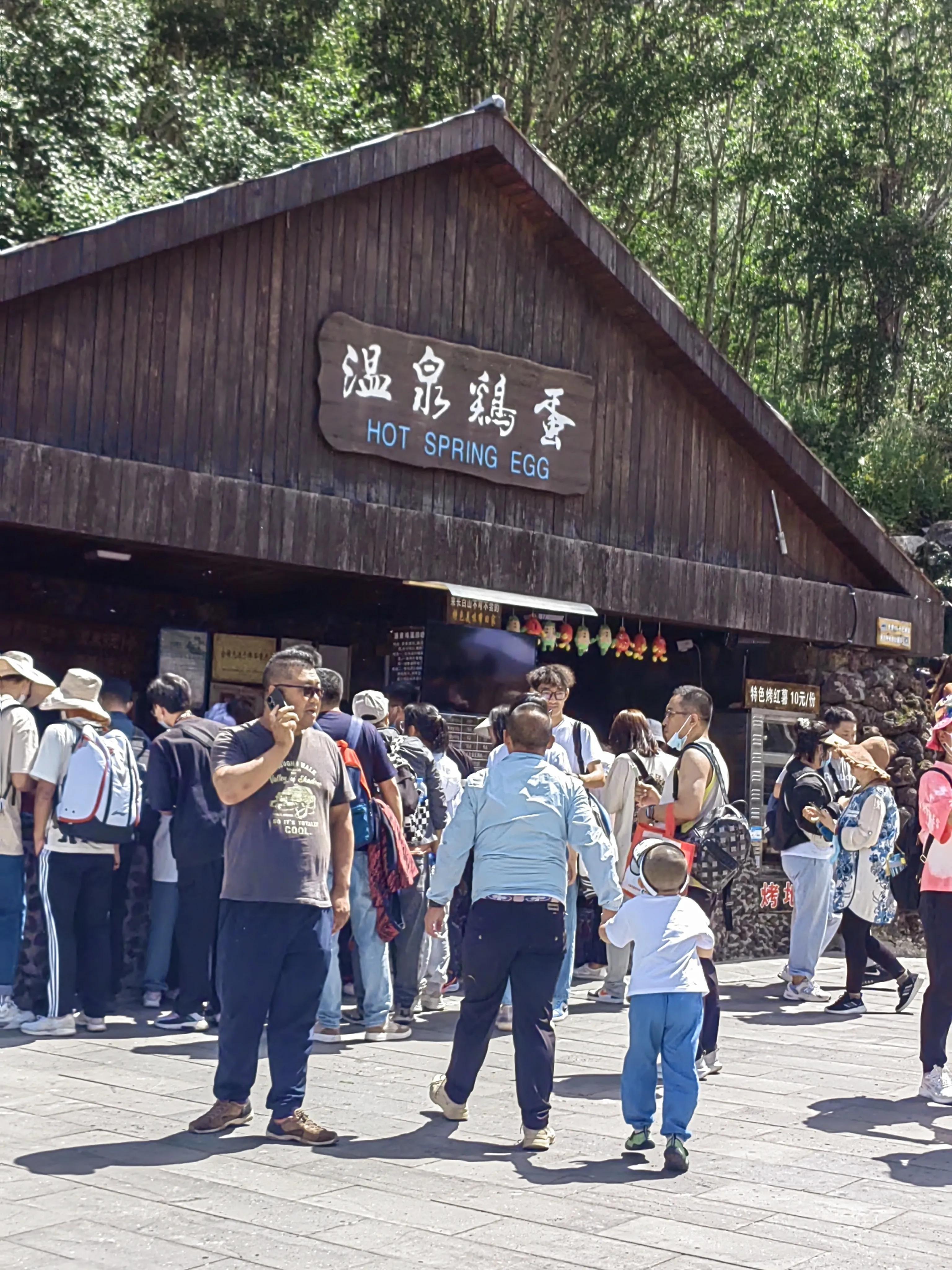 那就好好游玩瀑布吧!下了观光车以后,瀑布景区有很多小卖部,手抓饼啊,玉米啊,烤火腿啊,雪糕这些都是常规小吃了,最最有特色的就是温泉煮鸡蛋,温泉煮鸭蛋 温泉煮玉米,直接把鸡蛋鸭蛋玉米丢在大约八十摄氏度的温泉池中,我们都买了吃,味道挺好的,虽然剥开鸡蛋以后 蛋清部分很粘蛋壳,看起来没有完全熟,其实已经熟了,可以放心吃。小卖部往瀑布走的方向,还有很多温泉,一直往外冒着热气,水流非常清澈。继续往前走,看到瀑布流出来的水花,真的好漂亮,白白的浪花中隐约看到浅蓝色,从来没有看见郭如此漂亮的水。再往前走几百米就可以看到美丽的长白山瀑布了,好壮观!