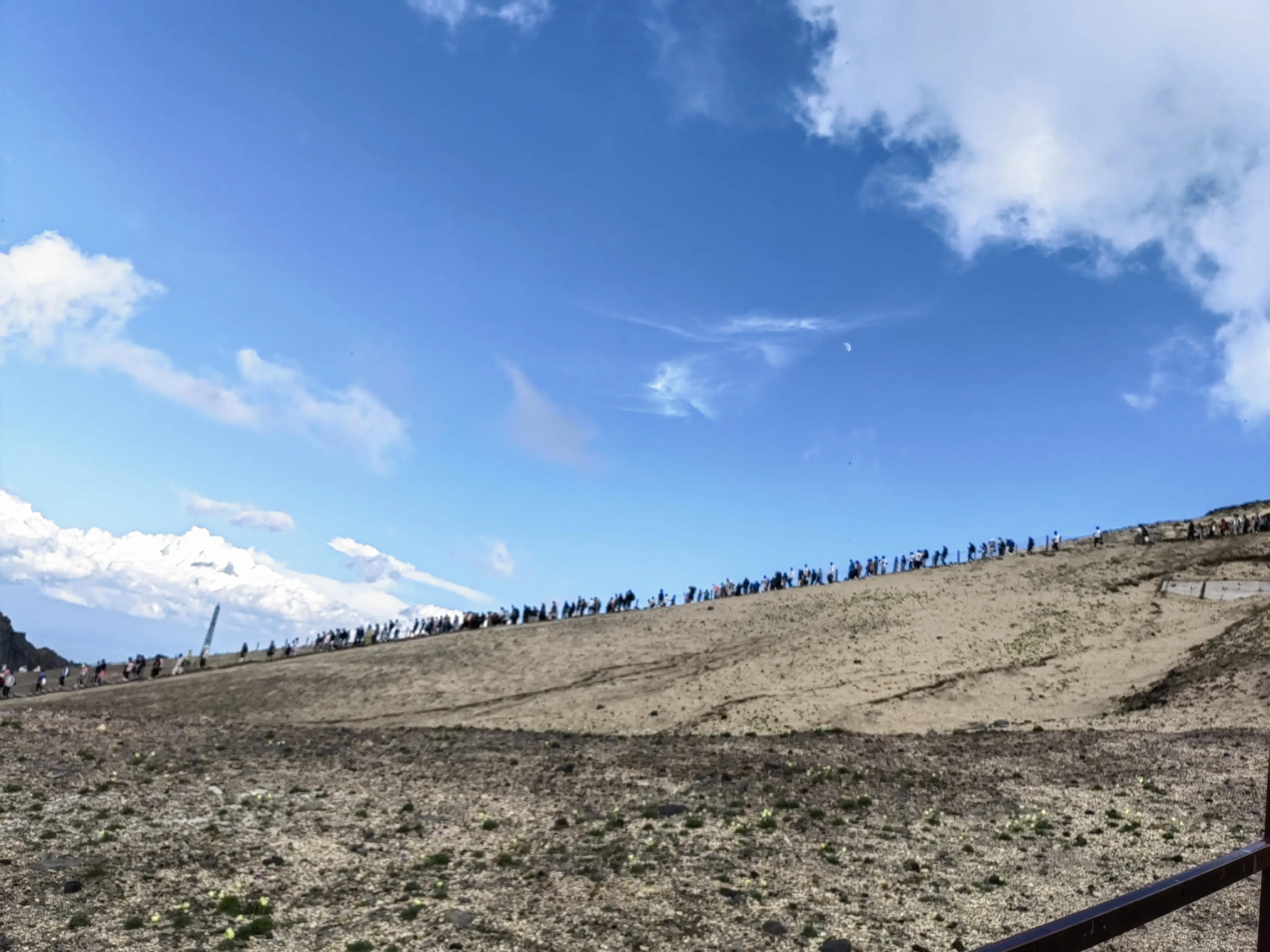 打出租车来到北景区集散中心以后,才发现来晚了 其实也就是上午九点多。虽然长白山气温不高,可是当头晒还是很晒呀。排队人群根本看不到头,工作人员说要去停车场,哇,停车场排队的尾巴好难才找到,终于排上了,但是从排队开始一直到检票口,再上景区观光车,大概花了一个半小时左右,现在知道当天有多挤了吧。而且当天北坡的票全部售完,如果没有提前网络购票,肯定是进不去了。开始还以为是周末的原因 (当天周六),附近的人趁着周末过来玩,后来才知道这一周一来,就是我们去那天天气最好,好多人在镇上住着,就等着那天好天气去看天池,甚至在我们去前一天,山上都是风大雨大。