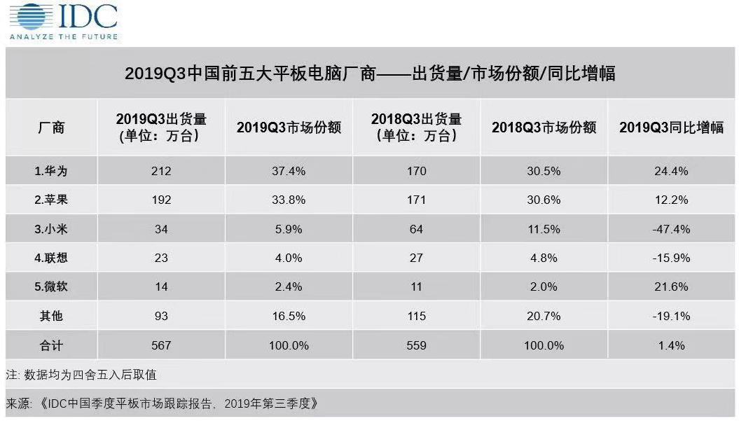 在前一段时间,国际数据公司(IDC)发布了我国在2019年第三季度的平板电脑市场报告。并且根据相关数据的统计,我国的平板电脑出货量已经保持了6个月的连续增长,而本季度的出货