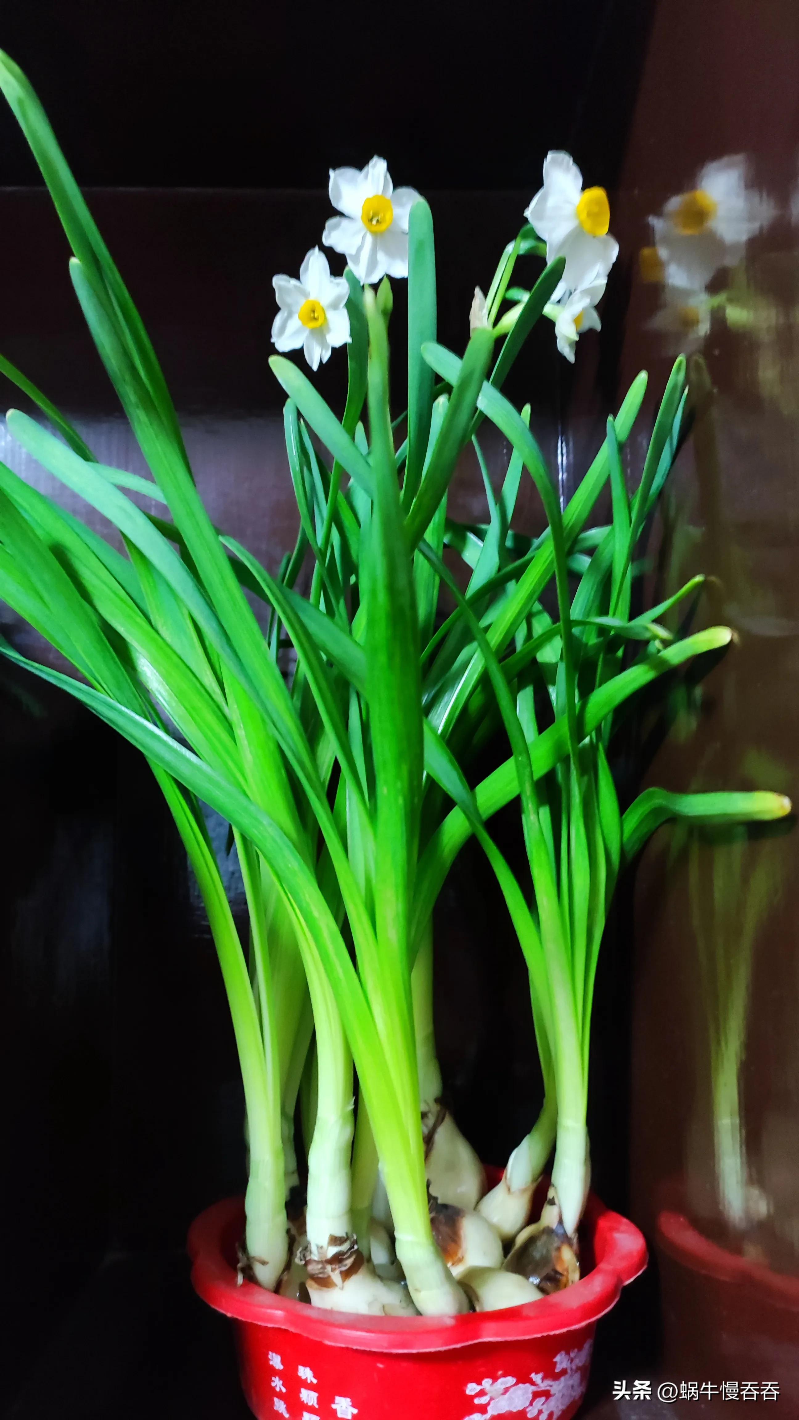 令我惊喜的是,居然店家还送了一大盆水仙花,已经有几朵花了,叶子茂密且翠绿。