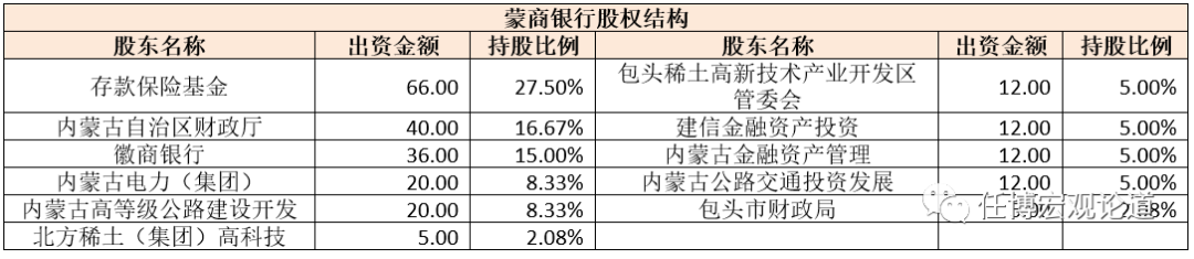 (2)新成立的蒙商银行注册资本为200亿元,股东出资为240亿元。目前存款保险基金、内蒙古财政厅和徽商银行分别位列蒙商银行前三大股东,持股比例分别为27.50%、16.67%和15.00%。