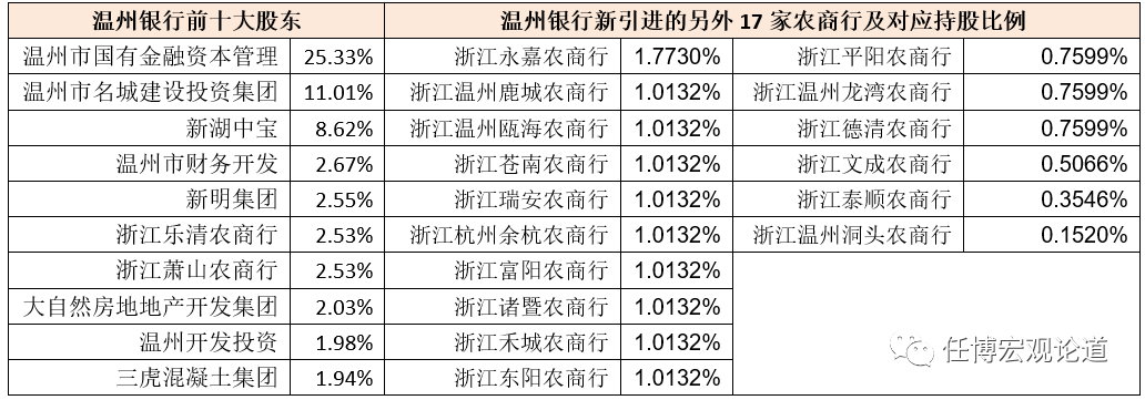 (2)此次增资扩股新引进的19家农商行有2家进入温州银行前十大股东序列,即浙江乐清农商行与浙江萧山农商行,持股比例均2.53%。不过尽管如此,温州银行的第一股东依然为温州市国有金融资本管理(持股25.33%),温州银行原来的第一大股东新湖中宝退至第三(持股比例18.15%降至8.62%)。