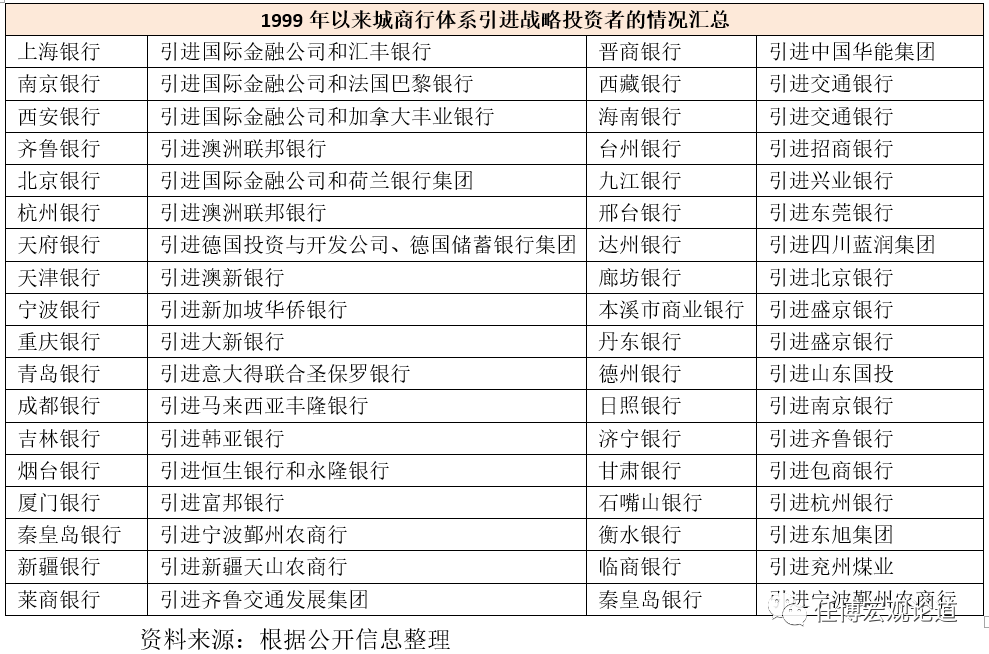 2002年9月5日,央行在其网站上公布了银行监管课题组的一篇报告《进一步发挥现有中小商业银行的作用》,明确提出“在化解地区金融风险过程中,中小商业银行形成了以地方政府为主导的股权结构……但地方政府的入股,必将对中小商业银行形成行政干预的压力……要支持中小商业银行的业务联合和重组”。这份报告为第二年独立出来的银监会提供了方向上的指引。2004年9月7日,刚成立不久的银监会表示“鼓励和支持城市商业银行积极开展引进境外战略投资者、上市和城市商业银行之间的联合与重组等项工作”。