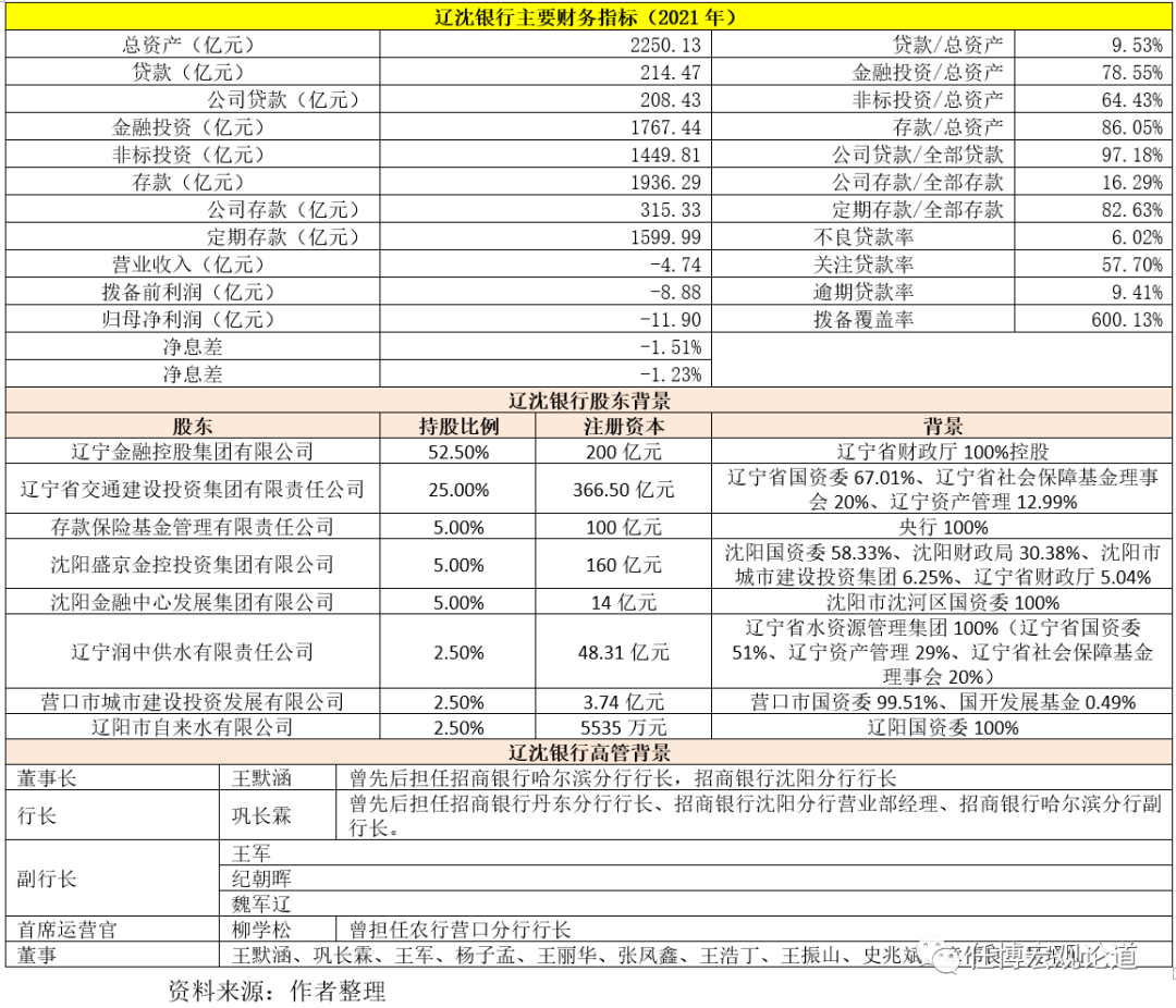 (6)辽沈银行合并的两家城商行,即辽阳银行与营口沿海银行总资产合计为2403.12亿元、注册资本合计为46.89亿元,和披露的2599亿元相差196亿元,较100亿元的注册资本仍然高出96亿元,预计是因为较2020年9月两家城商行的总资产还有一定增长所致。根据辽沈银行披露的2021年年报,截至2021年底,辽沈银行总资产达到2250亿元,存贷款余额分别为1936亿元和214亿元,全年实现营收-4.74亿元、净亏损11.90亿元、不良贷款率高达6.02%。