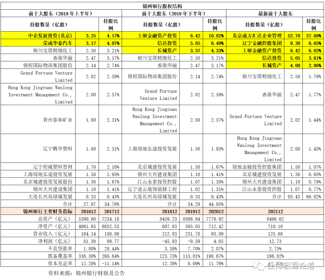 (1)和包商银行另起炉灶不同的是,锦州银行则是通过债务重组来完成处置。2019年,锦州银行因年报延迟披露等原因而暴露风险,在监管部门的指导下进行改革重组,引入工银投资、信达投资、长城资产等战略投资者(持有3.25亿股的中企发展投资(北京)与持有3.17亿股的荣成华泰汽车前两大股东退出),并转让部分内资股、剥离风险资产、实施增资扩股。