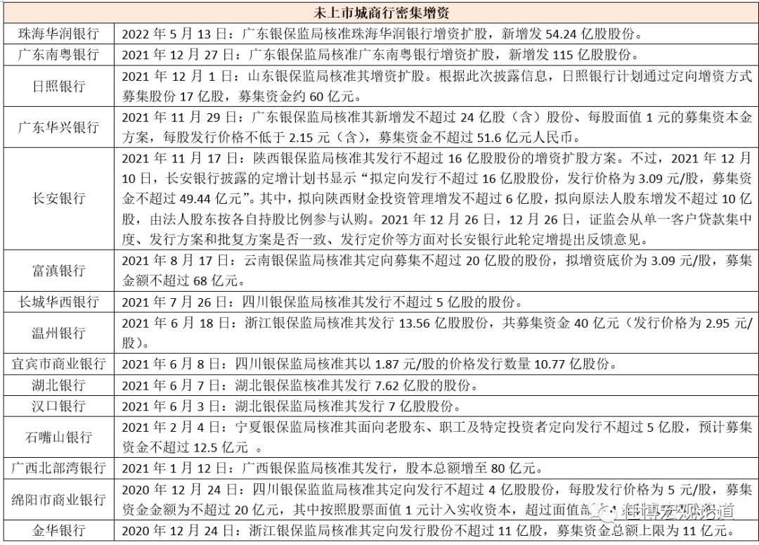 未上市银行增资主要有三个目的,一是为了提升信贷投放能力,二是为上市做准备、打好基础,三是增资过程中还可以兜售掉一部分不良资产。根据公开信息来看,仅2021年以来,便有珠海华润银行、广东南粤银行、日照银行、广东华兴银行、长安银行、富滇银行、长城华西银行、温州银行、宜宾市商业银行、湖北银行、汉口银行、石嘴山银行以及广西北部湾银行等11家城商行的增资扩股方案获批。预计,在上市、化险等动力下,未上市城商行的增资潮仍将持续。