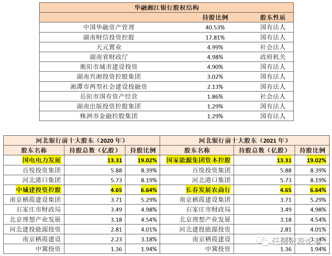 (1)2021年8月6日,原河北银行第一大股东国电电力发展发布《关于公司与国家能源集团进行资产置换暨关联交易的公告》称拟将其持有的河北银行全部股权及另一家子公司股权,与其控股股东国家能源投资集团旗下11家子公司进行置换。置换完成后,国家能源投资集团跻身河北银行第一大股东,国家能源投资集团持有国电电力发展的股权比例为46%。