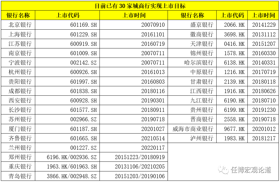 2、14家城产行完成了纯A股上市目标,分别为北京银行、上海银行、江苏银行、南京银行、宁波银行、杭州银行、贵阳银行、成都银行、西安银行、长沙银行、苏州银行、厦门银行、齐鲁银行与兰州银行。