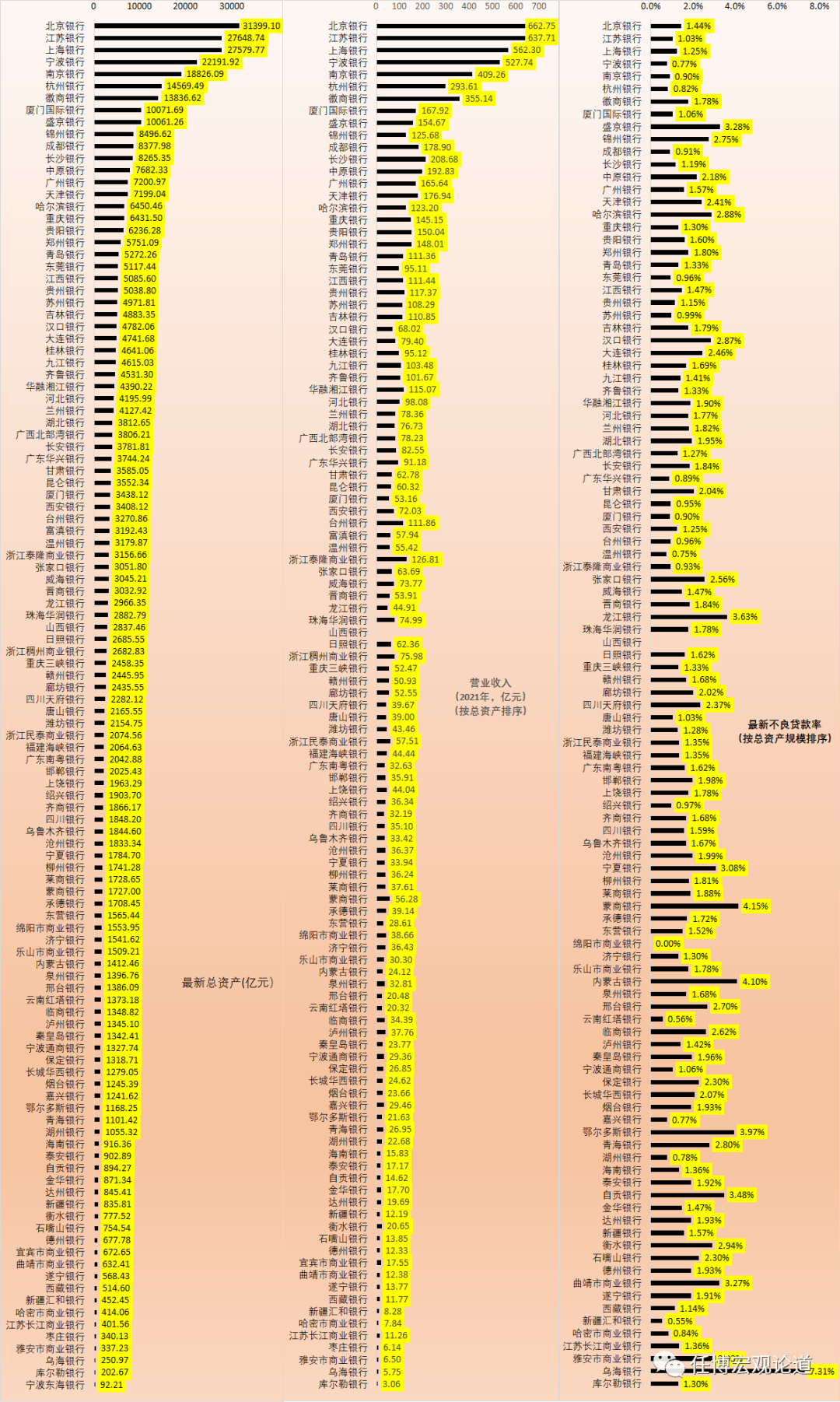 在国有大行与股份行之后(参见 强者恒强的国有六大行 与 12家股份行手册(2022年版) ),本文聚焦城商行这一群体(上市银行的分析可参见 全部59家上市银行经营指标排名大全(2021年底) )。
