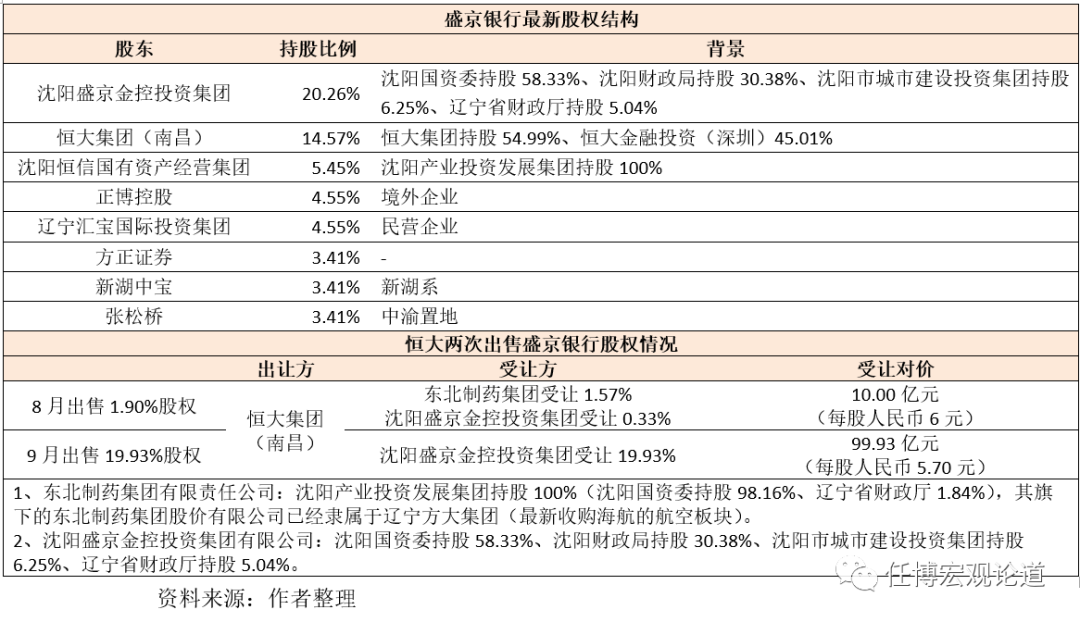 (1)2021年9月28日,恒大发布公告称将出售旗下全资子公司持有的盛京银行19.93%的股权(对应17.53亿股非流通内资股)。2021年10月15日,辽宁银保监局核准沈阳盛京金控投资集团受让恒大集团(南昌)持有盛京银行的17.53亿股内资股股份。