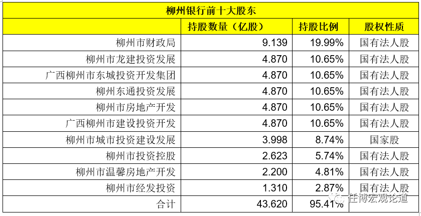 (3)多次调整后,目前柳州银行的前十大股东均为国资背景,合计持股比例高达95.415,且柳州市财政局的持股比例达到19.99%。