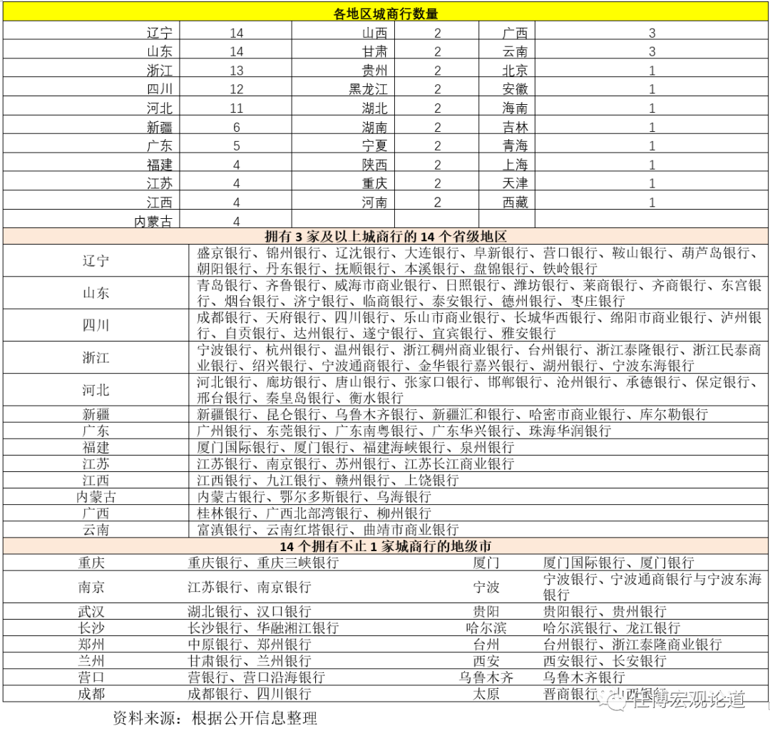 1、14个省级地区分别至少拥有3家城商行,集中于辽鲁川浙冀等地