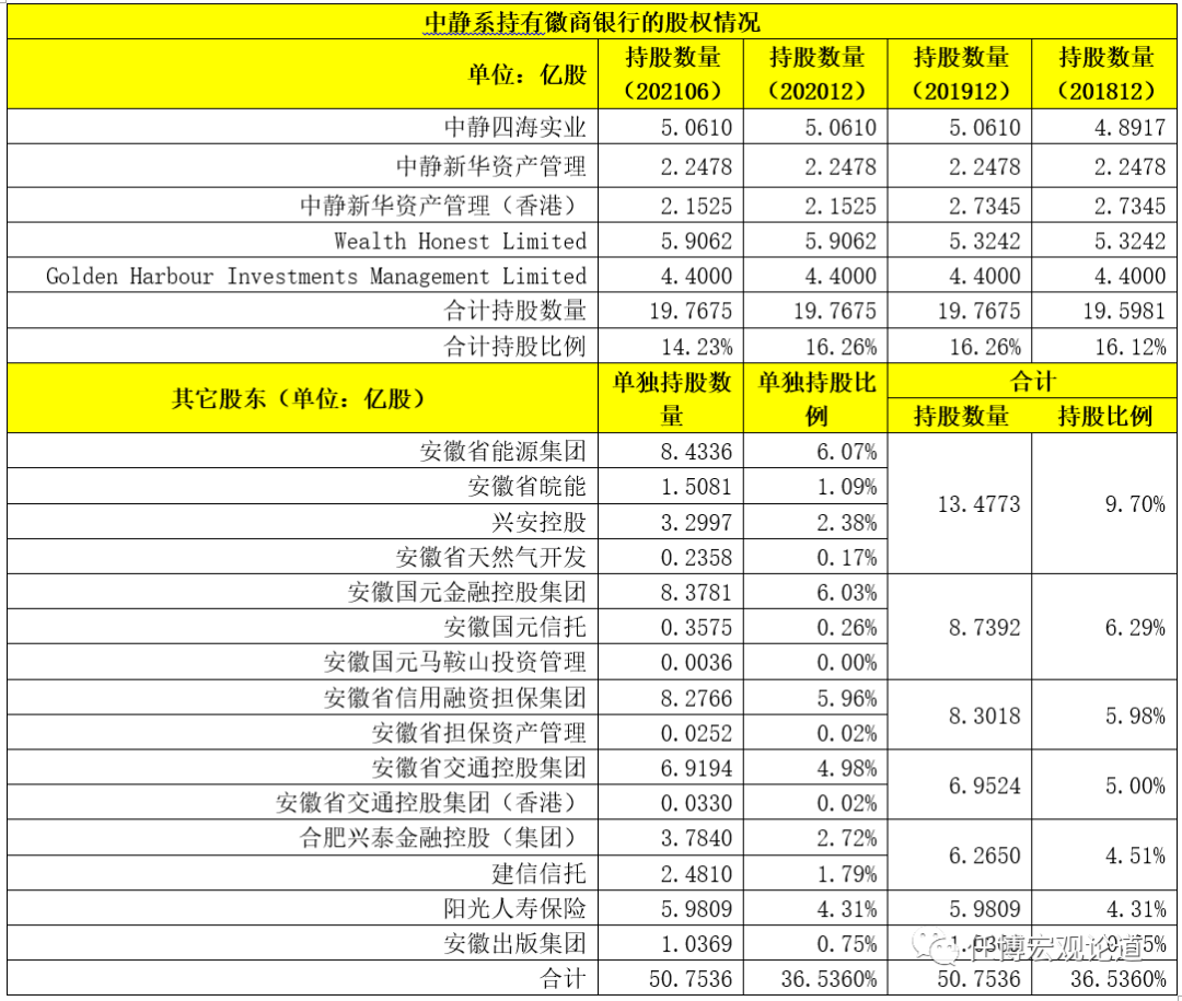(2)中静系主要通过旗下中静新华资产管理、中静新华资产管理(香港)、中静四海实业以及Wealth Honest Limited、Golden Harbor Investments Management Limited等主体持有徽商银行股份。截至2021年6月,中静系合计持有徽商银行19.7675亿股股份,持股比例达到14.23%,为徽商银行第一大股东。