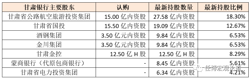 经过此次改革重组后,甘肃省公路航空旅游投资集团、甘肃省国投、酒钢集团、金川集团、甘肃金控以及甘肃省电力投资集团合计持有甘肃银行的股权比例达到56.53%,蒙商银行的持股比例则由之前的8.39%降至目前的5.61%、由第二大股东降至第六大股东。