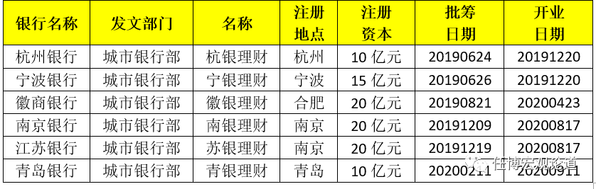 截止目前共有6家城商行的理财子公司获批筹建并正式开业,分别为杭州银行、宁波银行、徽商银行、南京银行、江苏银行、青岛银行和上海银行。虽然北京银行尚未获得,但其已拥有基金管理公司。