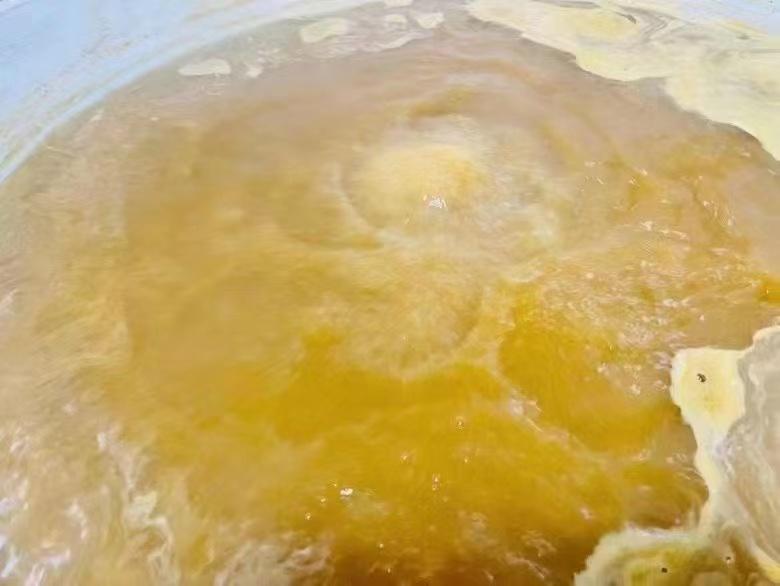 4、将枇杷汁熬制变粘稠,然后再放入适量的老冰糖,这时候要不停的搅拌,防止糊锅了,小火再继续熬制3个小时左右,直到熬制成浓稠的膏状,蒸锅过程需要8个小时候左右。