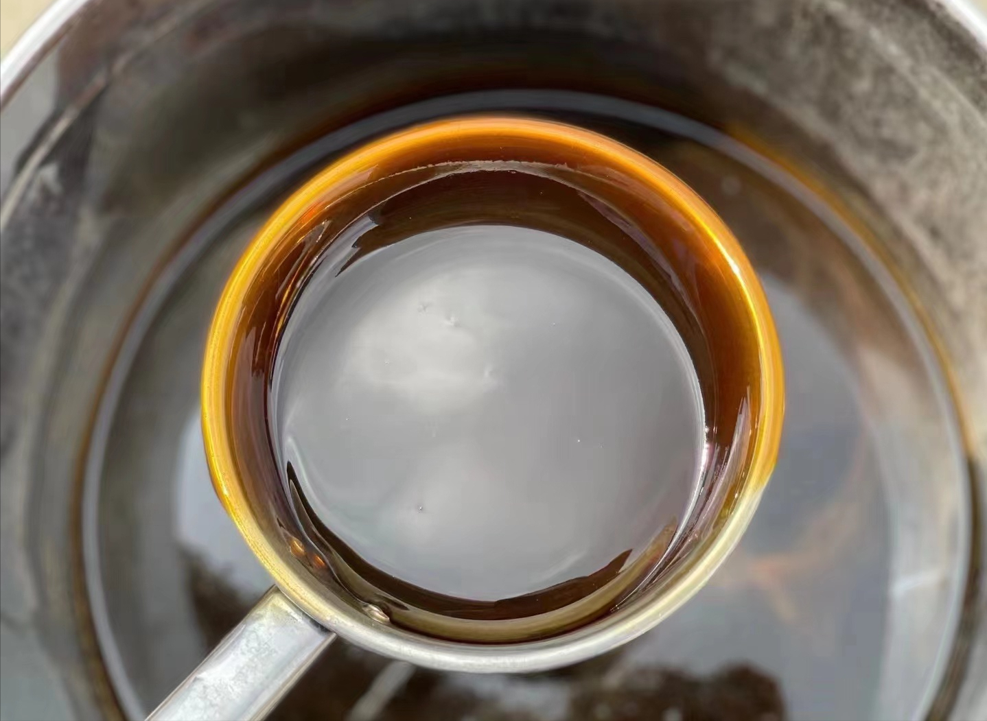 3、将枇杷膏倒入锅中,用柴火将枇杷汁煮开,熬制的过程中会出现浮沫,用勺子撇去浮沫,熬枇杷膏是比较考验耐心的。