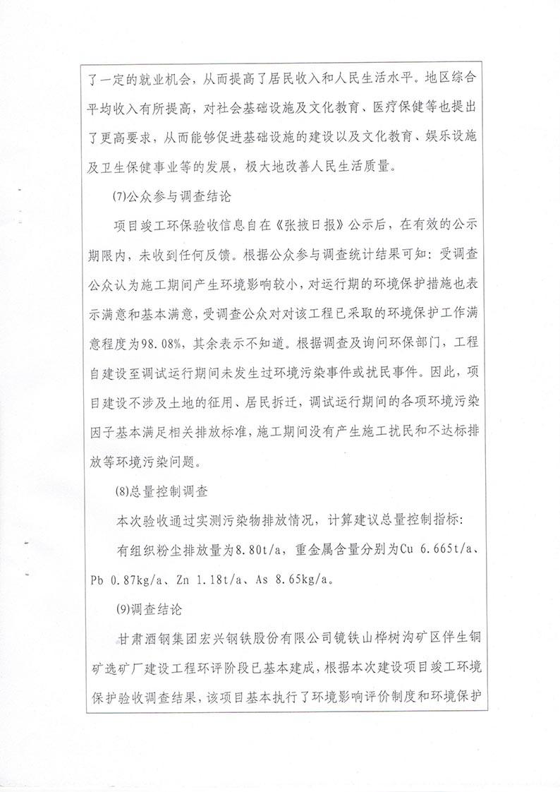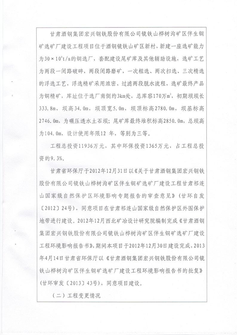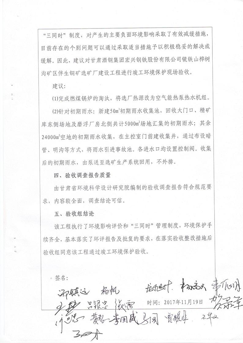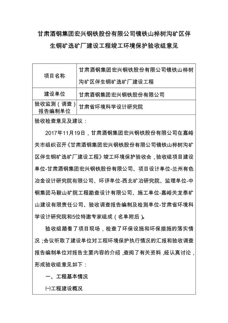 根据2017年10月1日开始施行的《建设项目环境保护管理条例》的相关规定,2017年11月19日,酒钢肃南宏兴矿业有限责任公司组织召开甘肃酒钢集团宏兴钢铁股份有限公司镜铁山桦树沟矿区伴生铜矿选矿厂建设工程竣工环境保护验收会议。验收工作组由建设单位(酒钢肃南宏兴矿业有限责任公司)设计单位(兰州有色冶金设计研究院有限公司、中钢集团马鞍山矿院工程勘察设计有限公司)、工程监理单位(马鞍山迈世纪工程咨询有限公司、中煤陕西中安项目管理有限责任公司)、施工单位(嘉峪关龙泰矿山建设有限责任公司)、环境影响报告书编制单位(西北矿冶研究院)、竣工环境保护验收调查单位(甘肃省环境科学设计研究院)及特邀5名专家组成。验收工作组会前现场查看并核实了本项目建设运营期配套环境保护设施的建设与运行情况。会议分别听取了建设单位对工程环保“三同时”执行情况的汇报、工程监理单位对环保设施建设情况的汇报、环评编制单位对工程环评相关情况的介绍和验收调查报告编制单位对工程竣工环境保护验收调查情况的汇报,验收专家组对验收调查报告进行了技术评估,经认真研究讨论形成了验收意见。