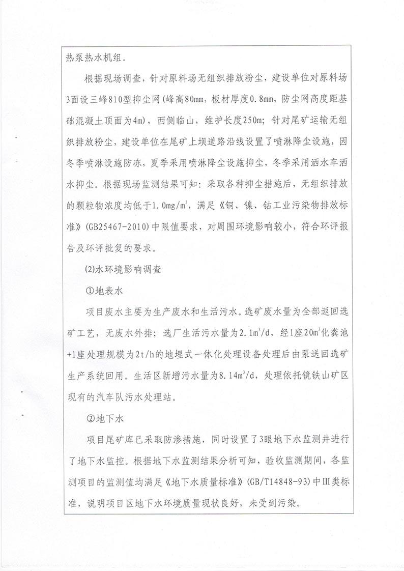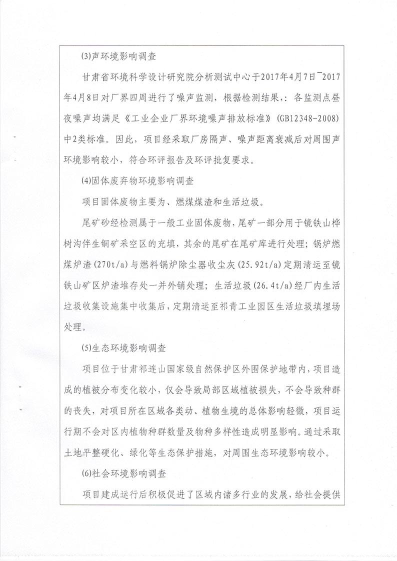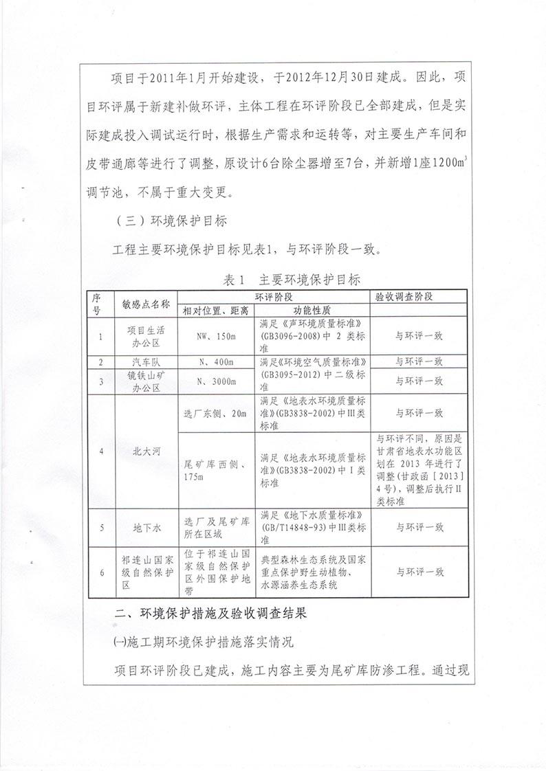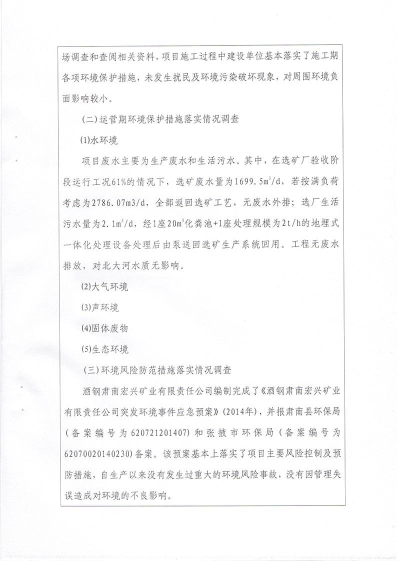 根据2017年10月1日开始施行的《建设项目环境保护管理条例》的相关规定,2017年11月19日,酒钢肃南宏兴矿业有限责任公司组织召开甘肃酒钢集团宏兴钢铁股份有限公司镜铁山桦树沟矿区伴生铜矿选矿厂建设工程竣工环境保护验收会议。验收工作组由建设单位(酒钢肃南宏兴矿业有限责任公司)设计单位(兰州有色冶金设计研究院有限公司、中钢集团马鞍山矿院工程勘察设计有限公司)、工程监理单位(马鞍山迈世纪工程咨询有限公司、中煤陕西中安项目管理有限责任公司)、施工单位(嘉峪关龙泰矿山建设有限责任公司)、环境影响报告书编制单位(西北矿冶研究院)、竣工环境保护验收调查单位(甘肃省环境科学设计研究院)及特邀5名专家组成。验收工作组会前现场查看并核实了本项目建设运营期配套环境保护设施的建设与运行情况。会议分别听取了建设单位对工程环保“三同时”执行情况的汇报、工程监理单位对环保设施建设情况的汇报、环评编制单位对工程环评相关情况的介绍和验收调查报告编制单位对工程竣工环境保护验收调查情况的汇报,验收专家组对验收调查报告进行了技术评估,经认真研究讨论形成了验收意见。