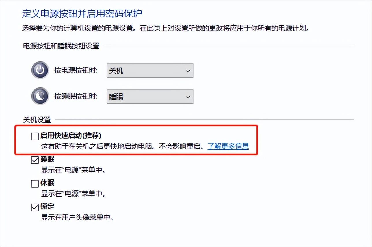4.关机设置下,【取消勾选】启用快速启动(推荐),最后,点击【保存修改】即可。
