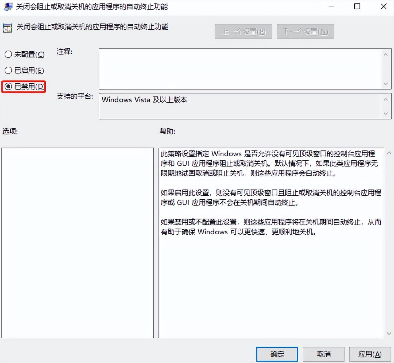 4.关闭会阻止或取消关机的应用程序的自动终止功能窗口,选择【已禁用】,再点击【应用确定】。
