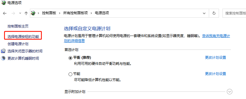 2.打开电源选项窗口,点击【选择电源按钮】的功能。