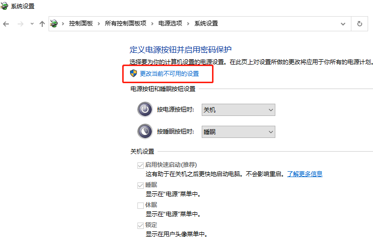 3.打开系统设置窗口,点击【更改当前不可用的系统设置】。