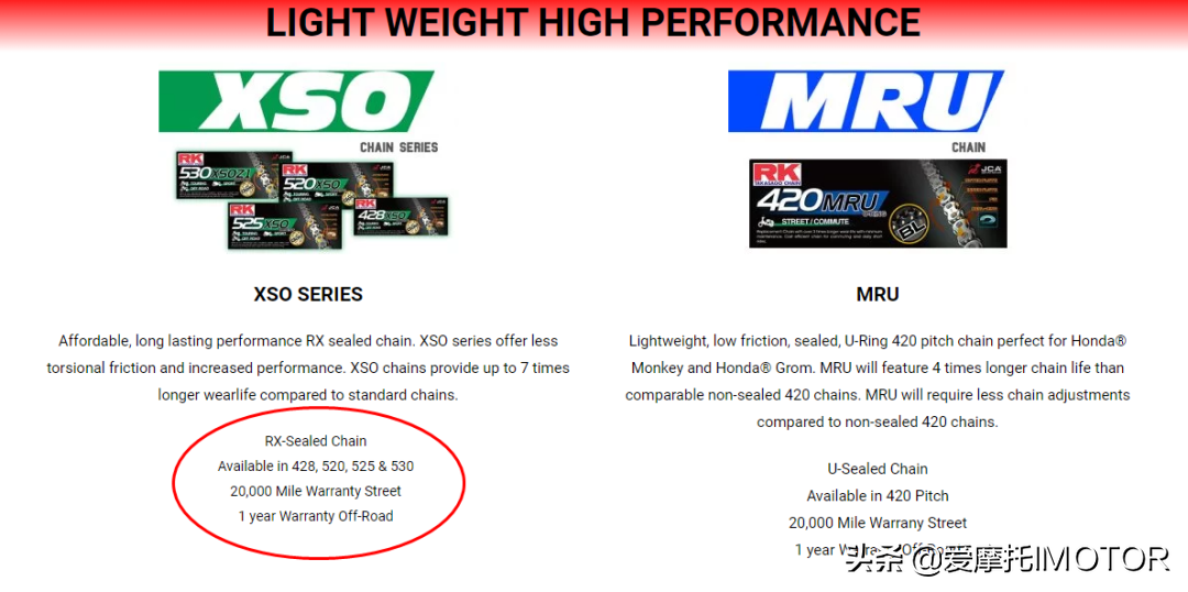 关于油封链条是不是智商税,这点其实我们在各品牌的官网都能查到测试成绩, 举例RK的520XSO2油封链条官方说明里寿命保证是铺装道路达到20000英里,或是非铺装1年,折合成公里都是32000公里才需要更 换 。