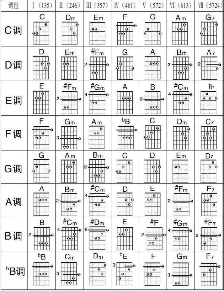 初学者弹吉他如何使用好变调夹呢?这里我说一个方法不超过吉他指板4品,可以弹12个调和弦歌曲,只需要掌握13个和弦就能弹12个调的歌曲了。首先放一个和弦调式图。