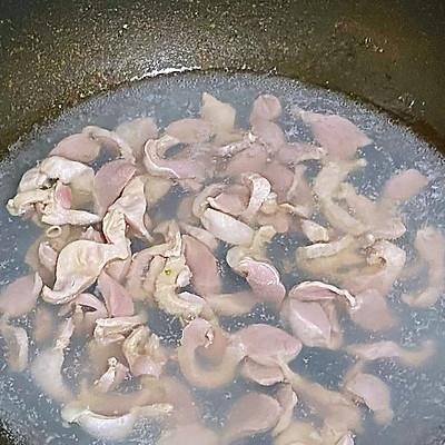 2、鸡胗浸泡、清洗干净,并去掉内部的一层软膜,然后切丝; 起锅烧水,水中加一勺料酒,水开后焯烫2-3分钟,捞出冲洗干净备用;