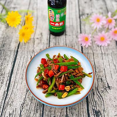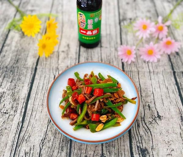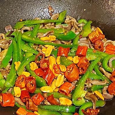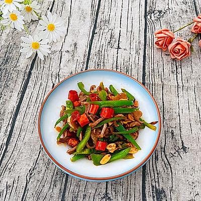 8、出锅前,倒入香脆椒,翻炒均匀即可装盘;