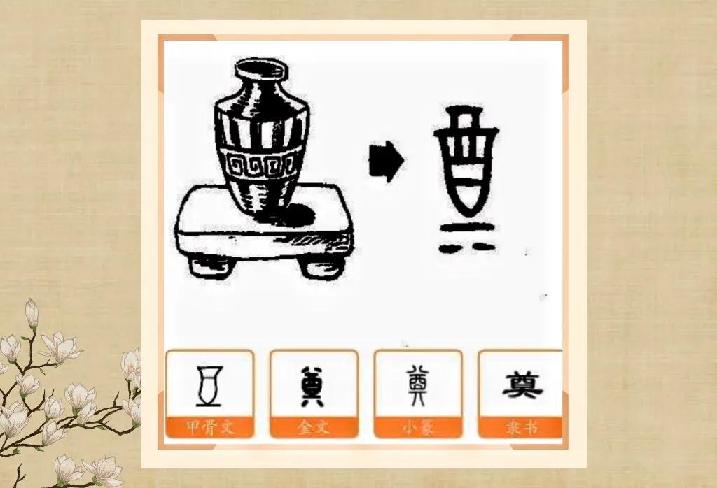 奠是一个象形字,它的甲骨文形态像一个酒器放置在平地上。后来的金文演变成上、中、下结构,“酋”,代表精心酿制的美酒;“一”代表桌面;最底下多了两点,像桌子的两条腿。