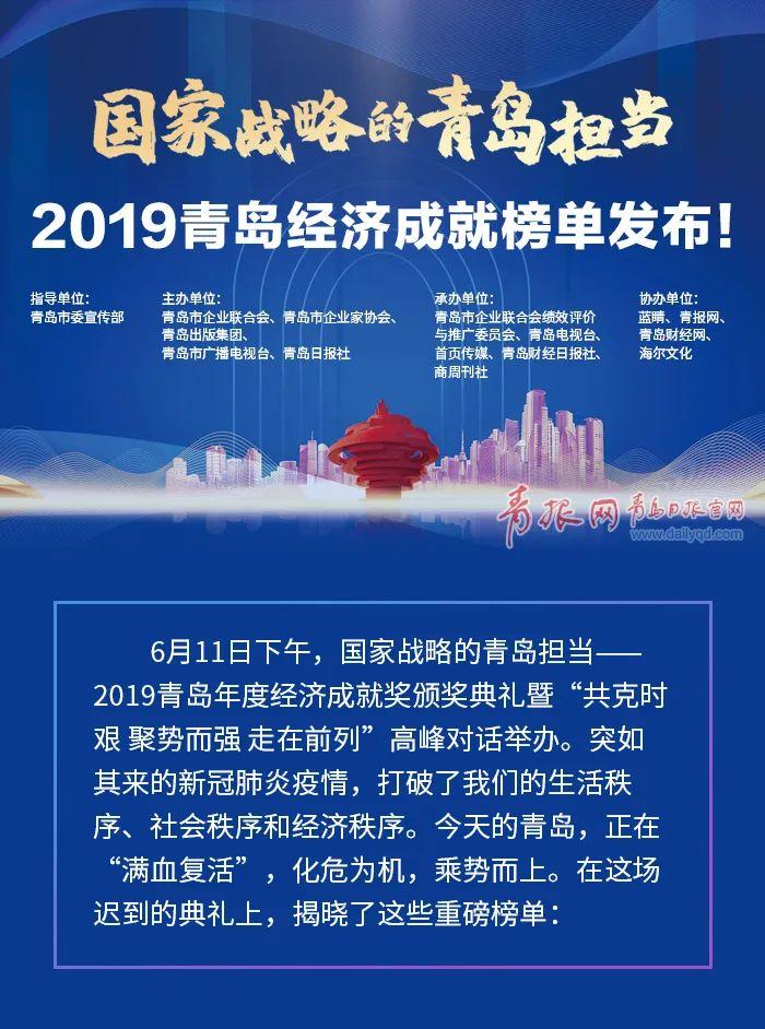 6月11日,在青岛年度经济成就奖颁奖典礼上,2019年青岛企业收入100强、2019制造业企业收入100强、以及2019十大年度经济人物、2019青岛最具影响力和最具创新力企业等名单发布。