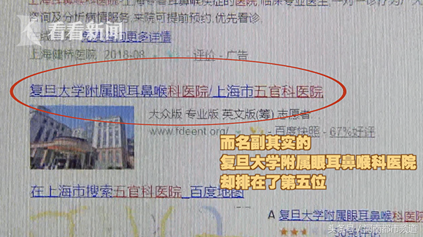 同样遇上糟心事的还有来自宁波的小周,她想去复旦附属眼耳鼻喉科医院看鼻炎,但通过百度查了几次,跳出来的都是复大医院。网络预约后,很快就有客服联系她,对于是否是复旦大学附属五官科医院的疑问,对方也吹得头头是道。