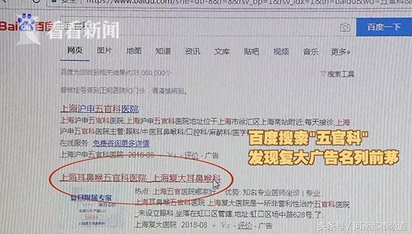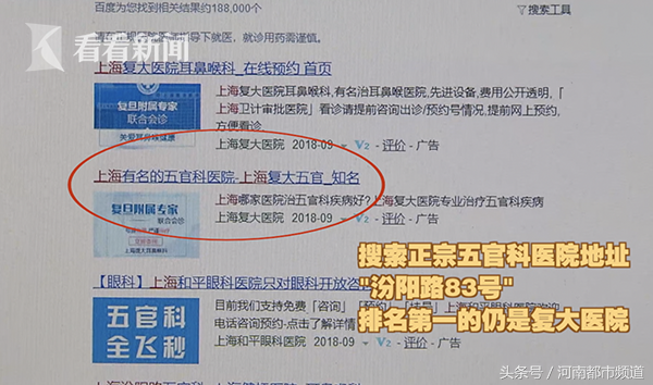 换一下关键词,搜索"五官科",或者"五官科医院",复大的广告依然名列前茅,网页标题为"上海耳鼻喉五官科医院"。名副其实的复旦附属五官科医院倒是排在了第五位。