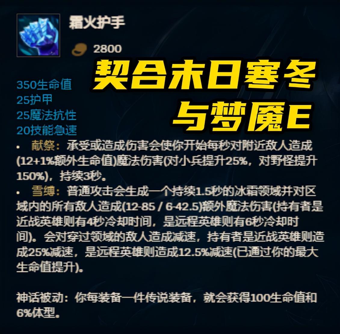 而霜火护手则是此前迎来加强,同样能提供减速,方便打出E技能的恐惧,一个加强一个削弱,则差距就出来了。并且霜火护手提供的减速,让身为近战的梦魇可以平A就打出末日寒冬的被动护盾效果,能大幅提升梦魇在中期的坦度。大幅提升梦魇的持续作战能力。