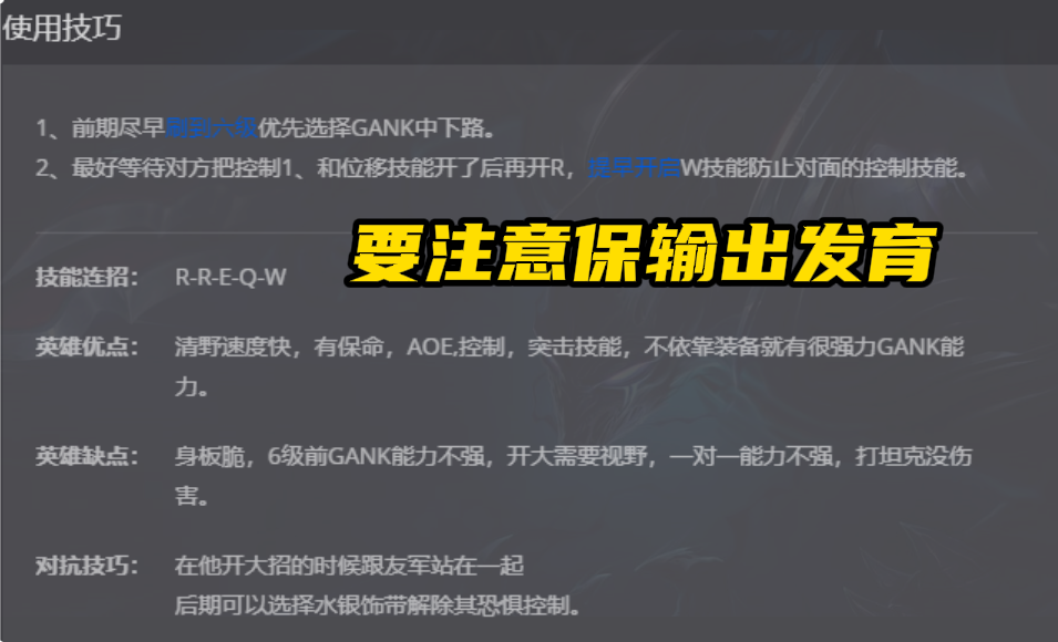 因此在队友有后期大核时,可以选择蓝梦魇的玩法,同时在前期一定要多帮大哥,让大哥在中后期有足够的伤害接管比赛。而如果队伍输出不足,那就要舍弃掉蓝梦魇的玩法,转型战士或者刺客流玩法了。