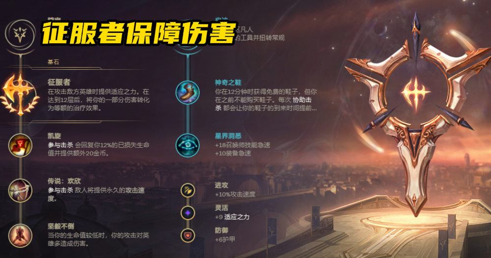 蓝梦魇由于装备是一身肉装,比较缺少攻击力面板,此时致命节奏加攻速也是刮痧。因此基石符文选择征服者,来配合着霜火护手的减速,最大化持续作战能力。主系符文随后推荐点出凯旋、欢欣、坚毅不倒,副系通常是选择启迪系的神奇之靴与星界洞悉。这样能白嫖300经济并让惩戒更早转好,提升打野效率。