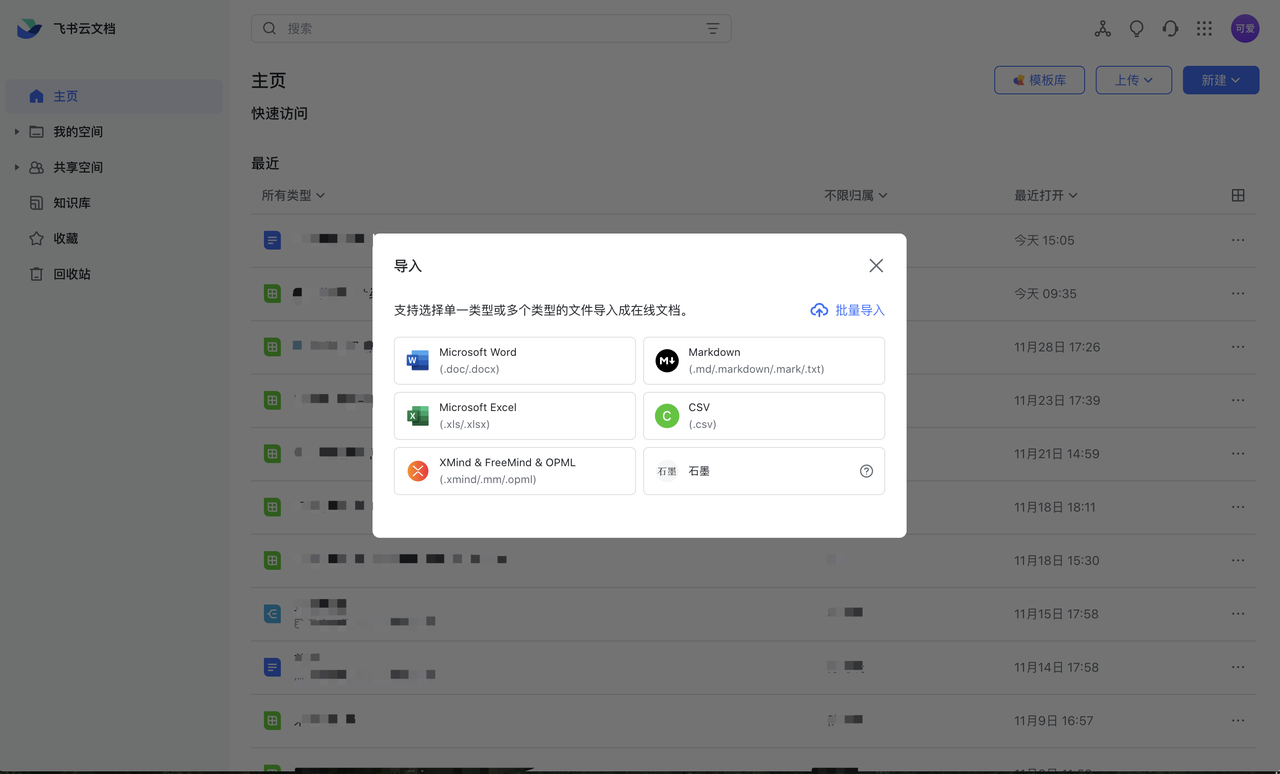 例如:飞书的文档导入功能,使用模态化对话框,引导用户选择文件类型或进行批量导入操作。