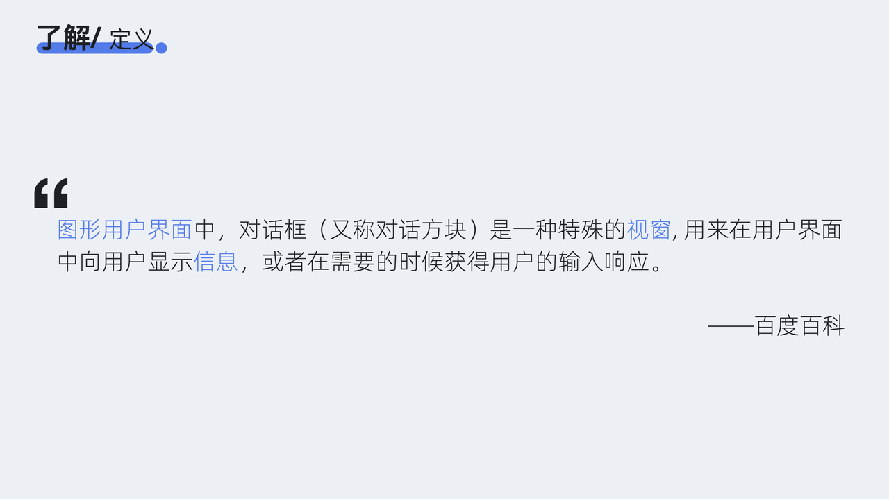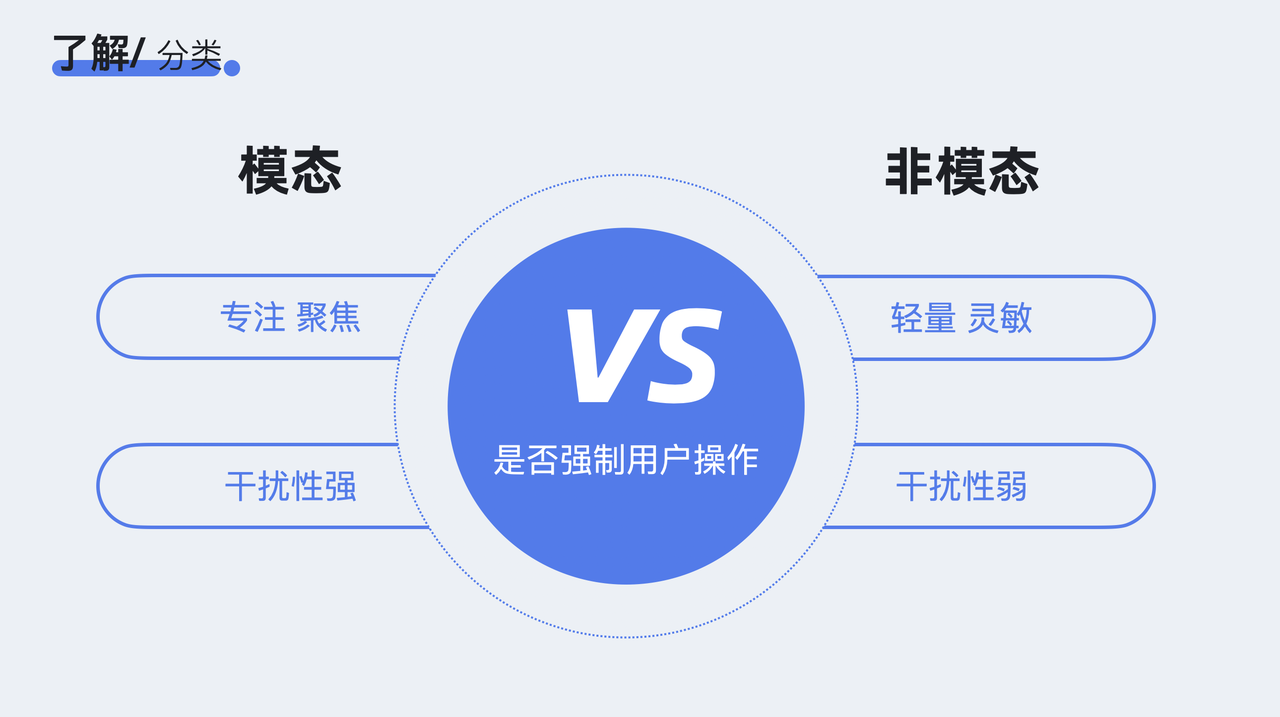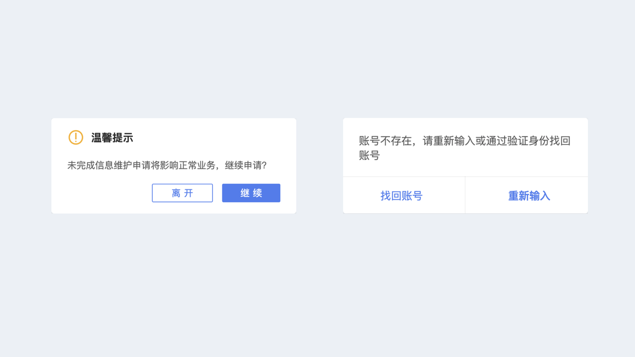 ②在需要用户输入信息或进行某操作,才能继续当前流程的时候使用。
