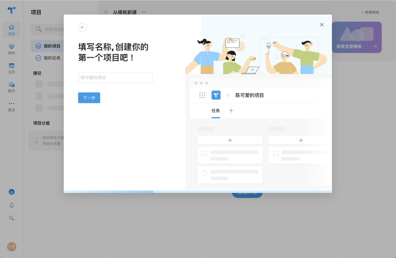例如:Teambition-分步骤的模态对话框式创建项目。