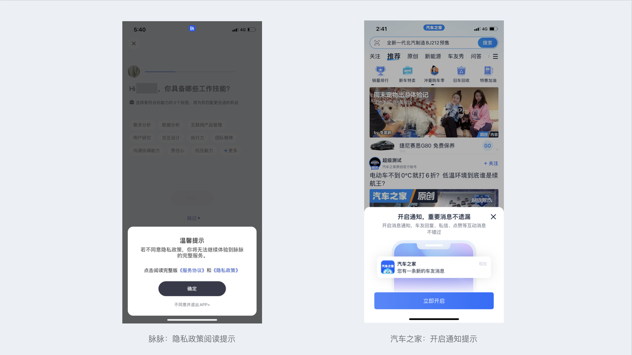 例如:脉脉的隐私政策阅读提示和汽车之家的开启通知提示,均采用模态对话框方式。