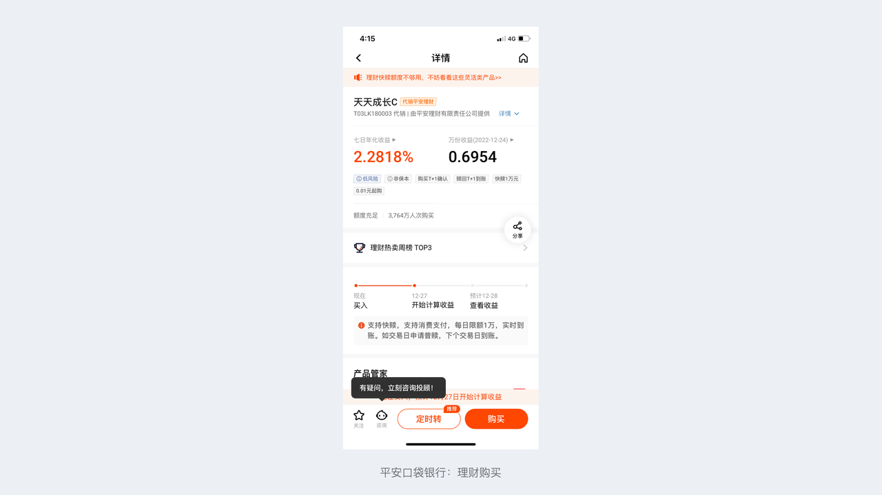 例如:在平安口袋银行APP中购买理财时,如果遇到疑问的话,不会弹出框提示让客户咨询投顾,而且采用气泡框形式提示,不打断用户购买。