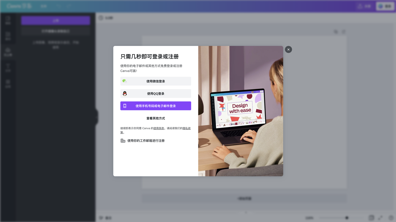 例如:在使用Canva资源网站时,点击“上传”会弹出模态化的登录/注册窗口,引导登录/注册后使用。