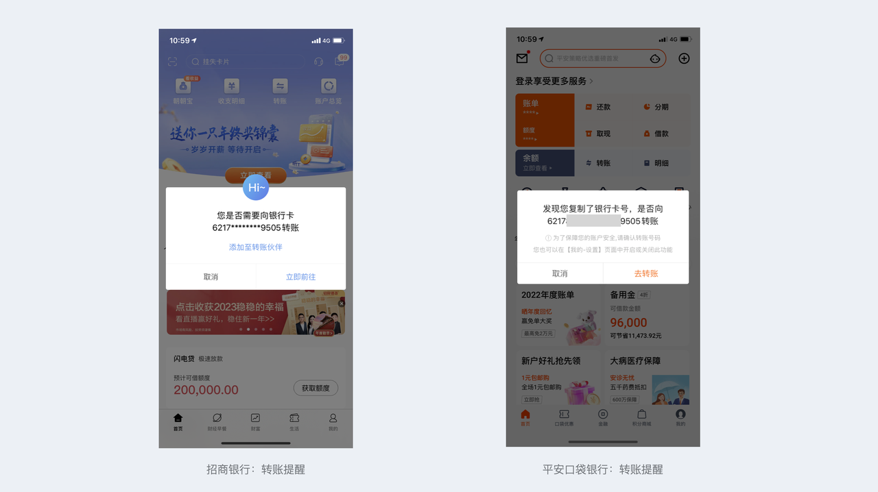 例如:在转账场景中,如果先复制一个账号,打开手机银行APP(以招商银行或平安口袋银行为例),系统会通过模式对话框询问用户是否向这个账号转账,这样的设计做到了预判用户行为,节省用户后面的操作成本。