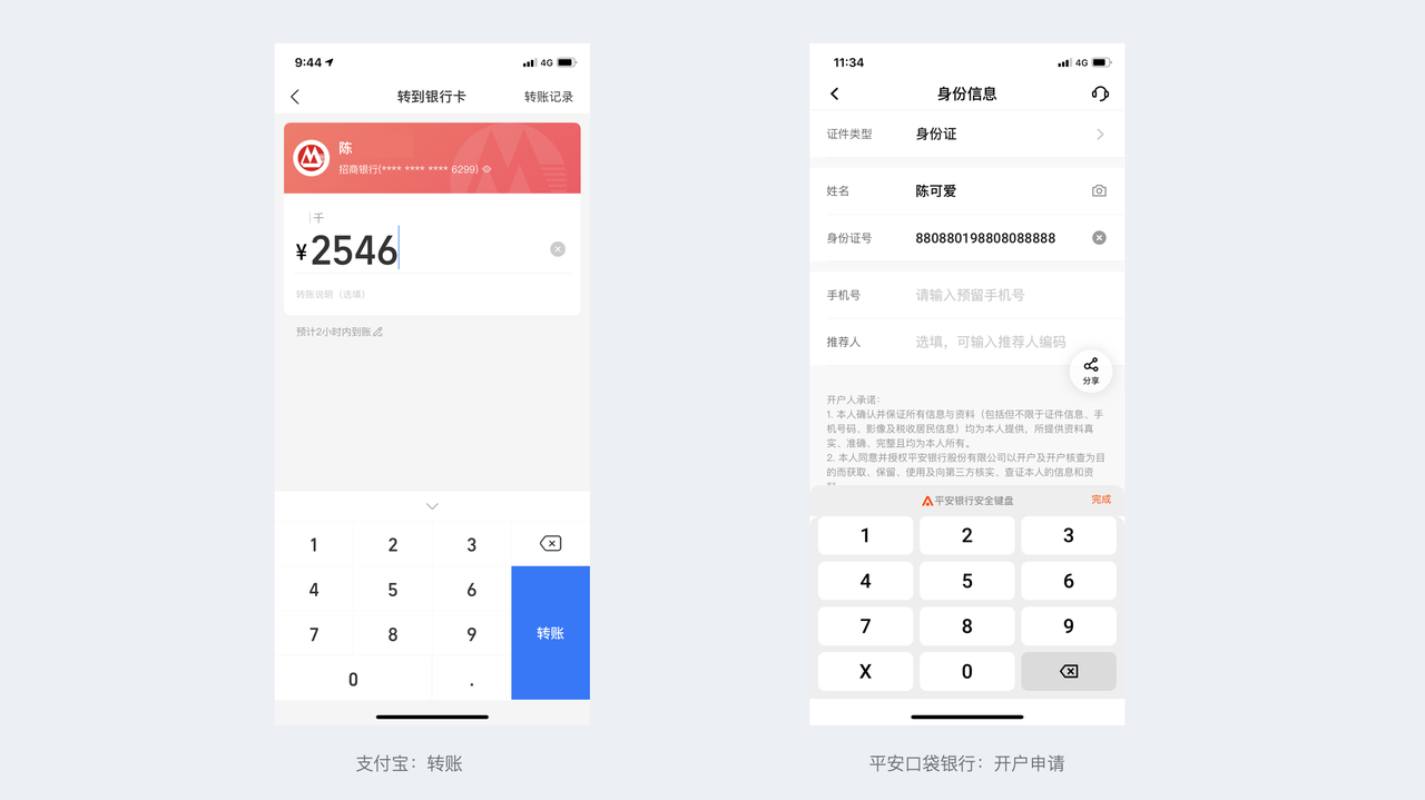 示例:转账时输入金额的数字键盘,金额大小的位数提示;平安口袋银行的身份证号专属键盘。